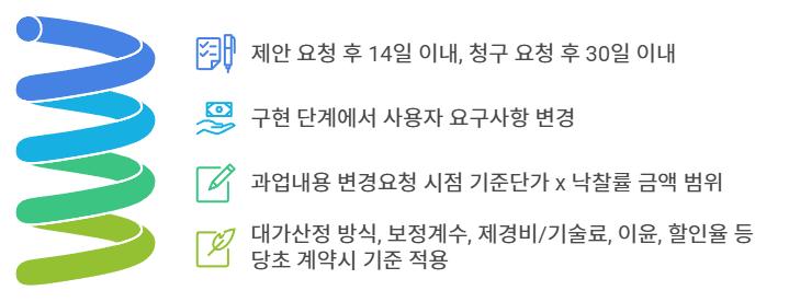- 계약상대자의 과업내용 변경 제안요청을 받은 날부터, 발주기관은 14일 이내에 승인여부를 통지