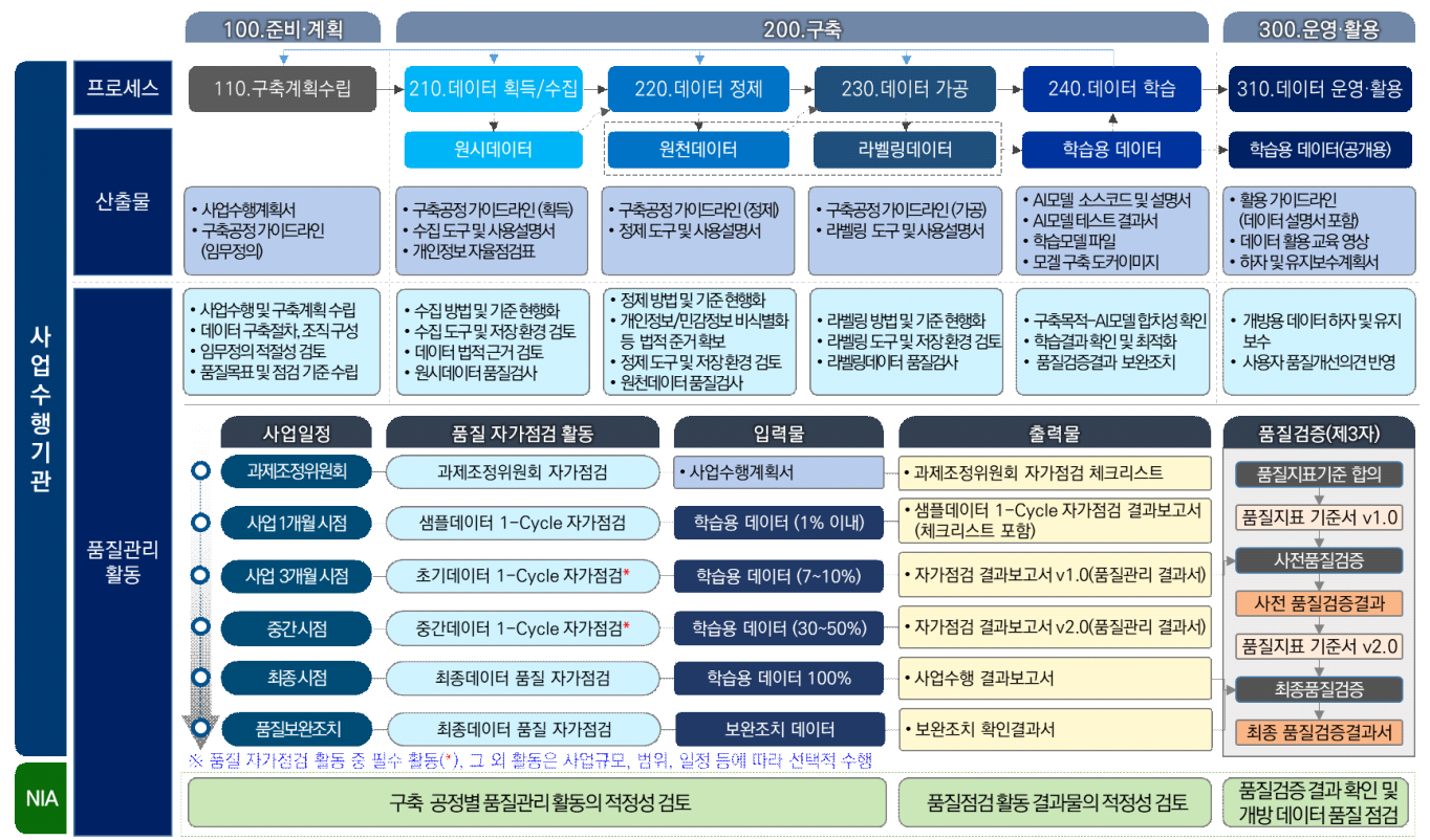 인공지능 학습용 데이터 품질관리 가이드라인은 다년간의 인공지능 학습용 데이터 구축사업을 통해 축적된 품질관리 활동 및 산출물을 프로세스화한 '품질관리 프레임워크'로