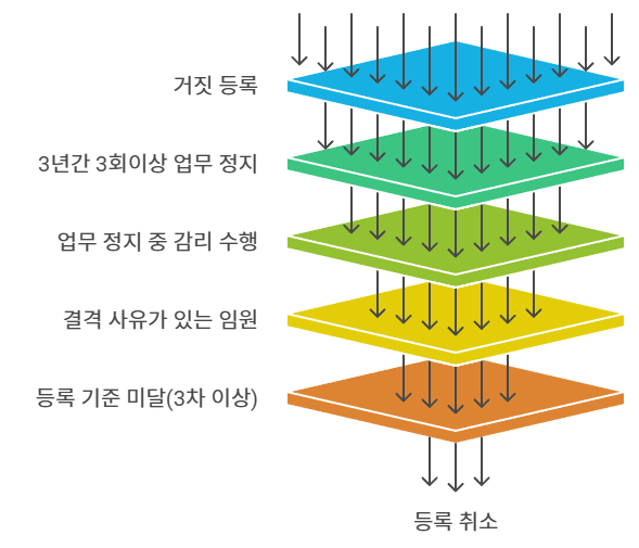 2. 감리법인의 등록기준에 미달(1차 경고, 2차 업무정지 1개월, 3차 등록취소)