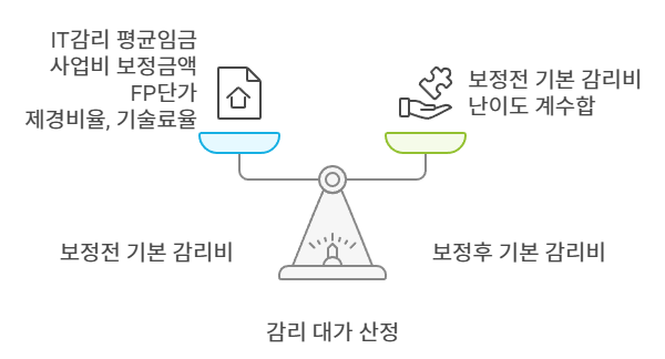 보정전 기본감리비는 IT감리 평균임금, 감리대상 사업비 보정금액, 제경비율, 기술료율 항목으로 구성