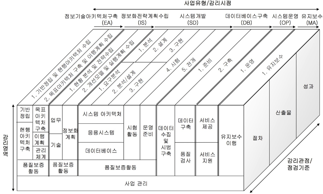 정보기술아키텍처구축(EA), 정보화전략계획수립(IS), 시스템개발(SD), 데이터베이스구축(DB), 시스템운영(OP), 유지보수(MA)로 나누어져 있다.